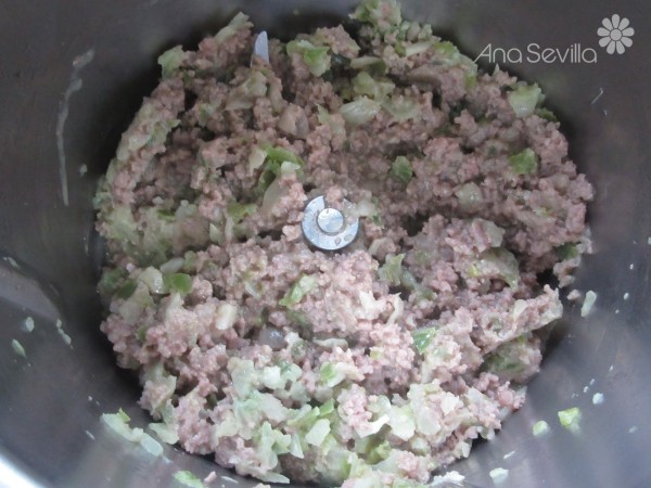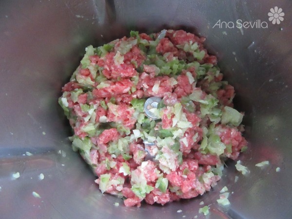 2- Agregar la carne picada, remover un poco con la espátula, sofreír 5 min. 100º, giro izda. , vel. cuchara.