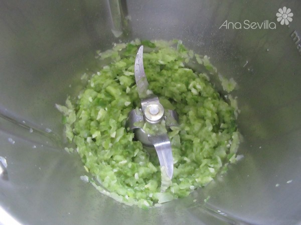 1- Picar la cebolla, pimiento y ajo, 2 seg. vel.5, bajar restos hacia las cuchillas. Añadir el aceite, pochar 8 min. Varoma, vel. cuchara.