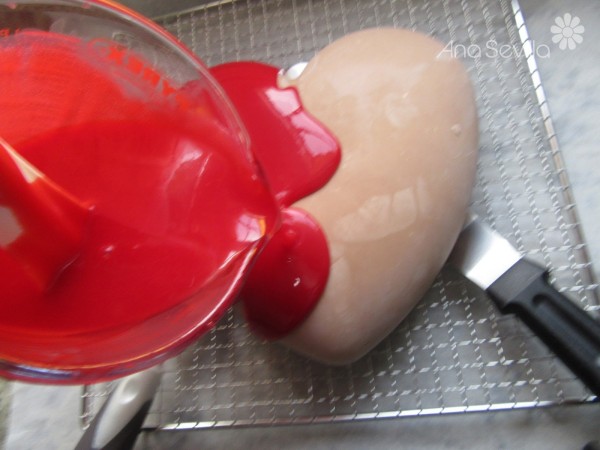 4- Desmoldar la mousse sobre una rejilla cubrir con el glaseado y una fuente debajo, para que vaya cayendo el sobrante.