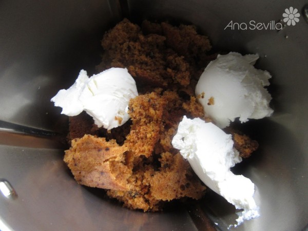 6- En dos tandas, mezclar la mitad del bizcocho con 100 gr. queso de untar, 10 seg., giro izda., vel.4.