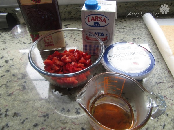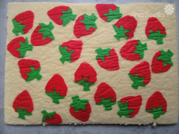 Cuando enfríe, extender la crema de mascarpone, repartir las fresas en trocitos, enrollar ayudándose con el papel de hornear con cuidado y llevar a la nevera.