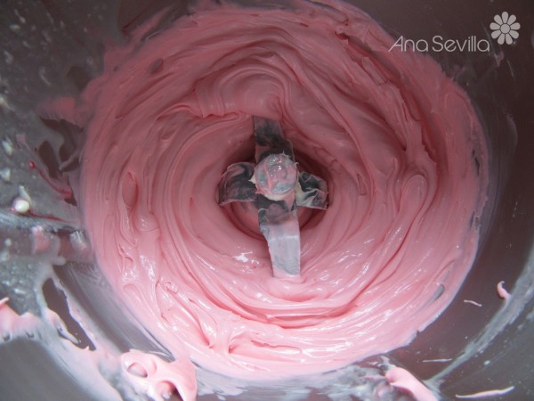 1- Mezclar el queso, nata, azúcar glas y colorante, unos segundos a vel.4. Hasta que veamos que queda como un merengue.
