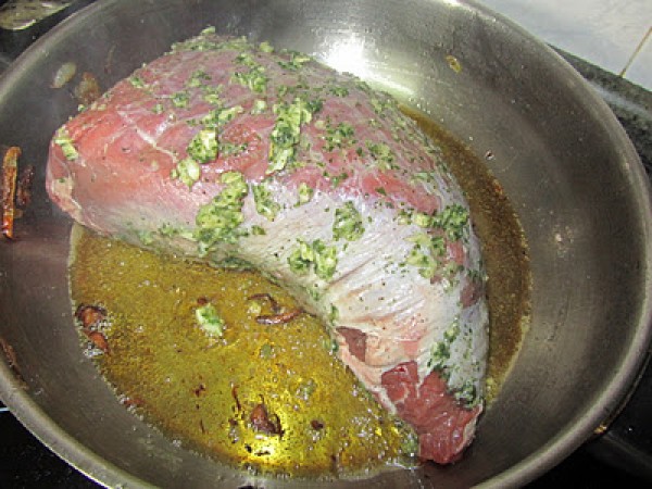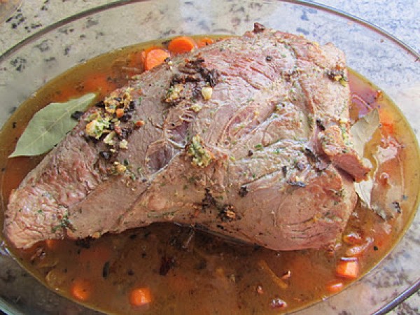 7- Llevar al horno (180º arriba y abajo) por espacio de 2 horas, según el tipo de carne. Regar la carne con los jugos cada media hora y darle la vuelta de vez en cuando. Si veis que se seca mucho, echar más vino blanco.