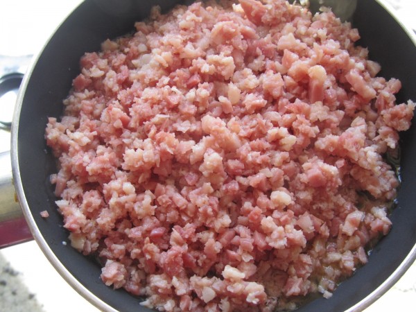 2- Picar el bacon muy menudo y añadir el aceite y sofreír hasta que comience a dorarse. Reservar un poco para el adorno final.