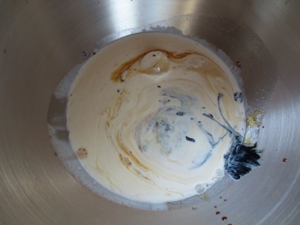 3- En otro bol, mezclar los huevos, nata, vainilla y colorante.