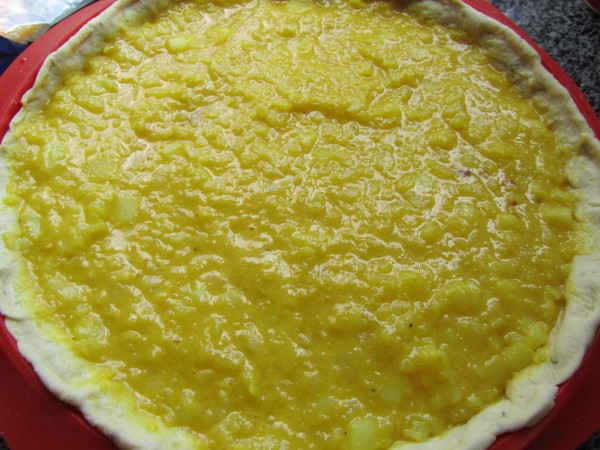 5- Estirar la masa una vez desgasificada y forrar un molde de quiche , fondo y paredes, ayudaros con los dedos. Extender la mitad de la tortilla alisando bien, cubrir con el tomate y napar con el resto de tortilla. Espolvorear con queso rallado y orégano .