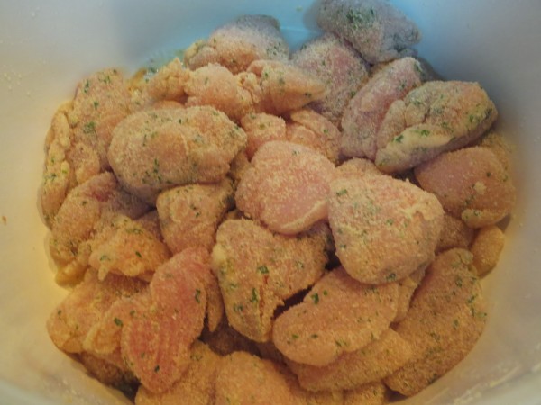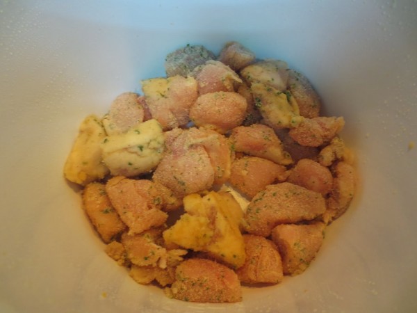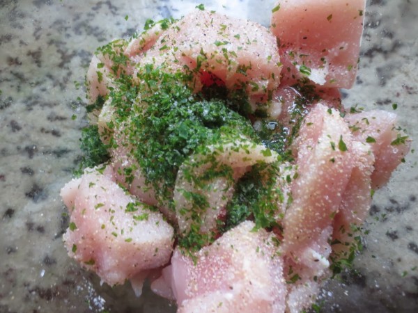 1- Cortar la pechuga en dados no muy grandes, salpimentar, espolvorear con ajo en polvo y perejil picado y 1 cda. de aceite de olivar, mezclar bien para que se impregne la carne.