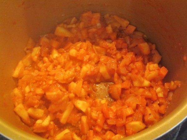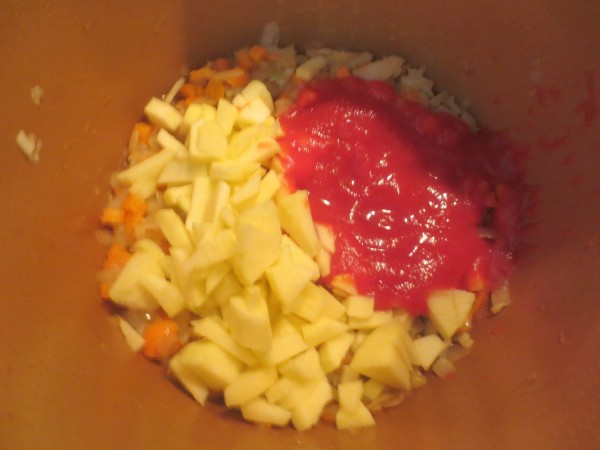 3- Cuando esté blando, añadir la manzana en trocitos y el tomate, y sofreír unos 4 minutos.