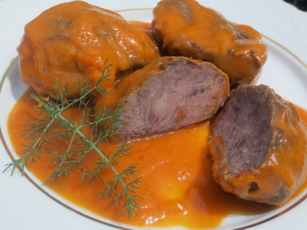 Sacar la carne y laurel y triturar la salsa con el turmix o thermomix 20 seg. vel.8. Dar un hervor a a salsa con la carne, para que tome sabor.