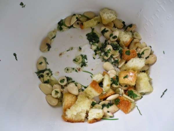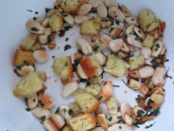 1- En el aceite que queda, sofreír el pan en tacos, ajo en láminas, perejil picado y almendra cruda hasta que tome color. Añadir el vino blanco y un poco de agua y triturar hasta que quede fino.