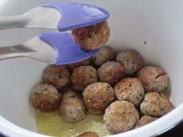 1- Majar 2 dientes de ajo con perejil y 1 cta de sal. Añadir a la carne junto al pan rallado, huevo, chorrito de vino blanco y pimienta, mezclar bien y formar las albóndigas. Podéis untaros las manos en aceite para formarlas, quedan mejor.