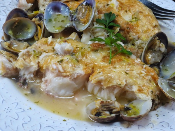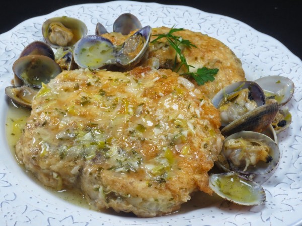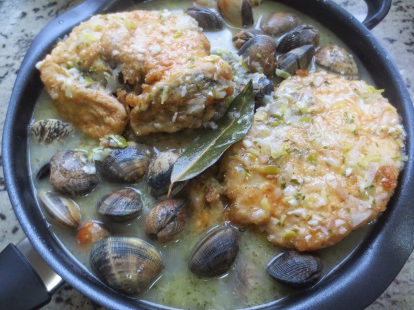 7- Escurrir las almejas con el cestillo lavándolas bien, repartir por la cazuela, volcar la salsa y cocer a fuego medio unos 5 minutos tapado, hasta que se abran las almejas.