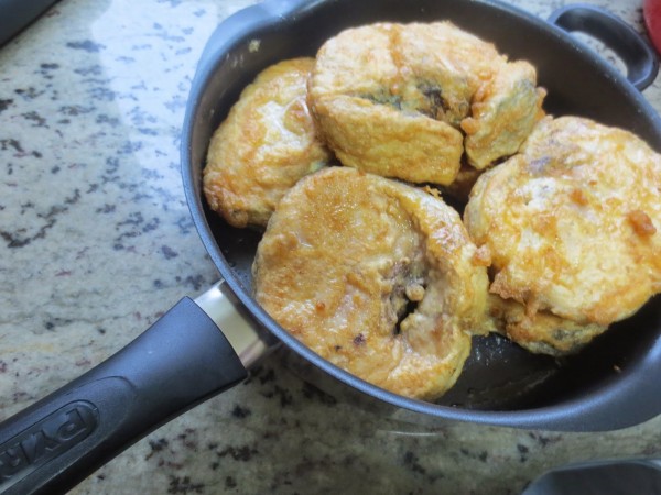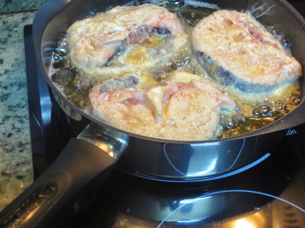2- Salpimentar las rodajas de merluza, pasar por harina, sacudiendo el exceso y por huevo, freír por ambos lados en aceite abundante e ir reservando en una cazuela.