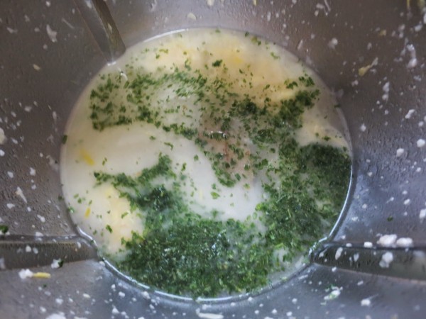 6- Caldo de pescado, perejil picadito y laurel, y cocer unos 6-10 minutos para que reduzca un poco.