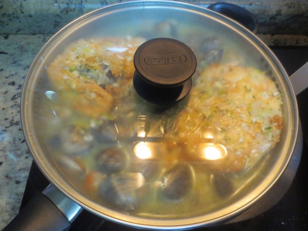 7- Escurrir las almejas con el cestillo lavándolas bien, repartir por la cazuela, volcar la salsa y cocer a fuego medio unos 5 minutos tapado, hasta que se abran las almejas.