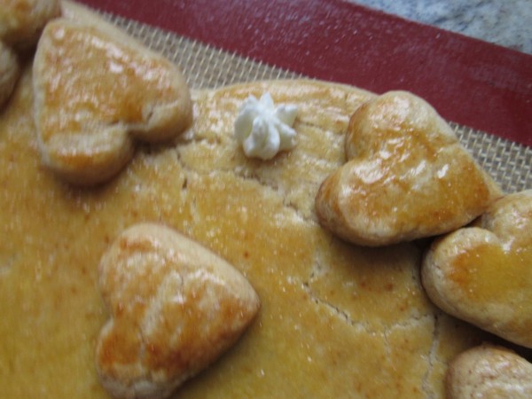 4- Agregar el vino dulce, levadura , harina y sal, y mezclar bien hasta que quede la masa bien integrada. Llevar a la mesa de trabajo espolvoreada de harina, estirar la masa suavemente y cortar en forma de corazón, con los restos cortar pastitas pequeñas un poco gruesas. Pintar con huevo y hornear unos 18-20 minutos. Dejar enfriar antes de manipular.