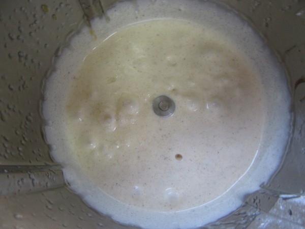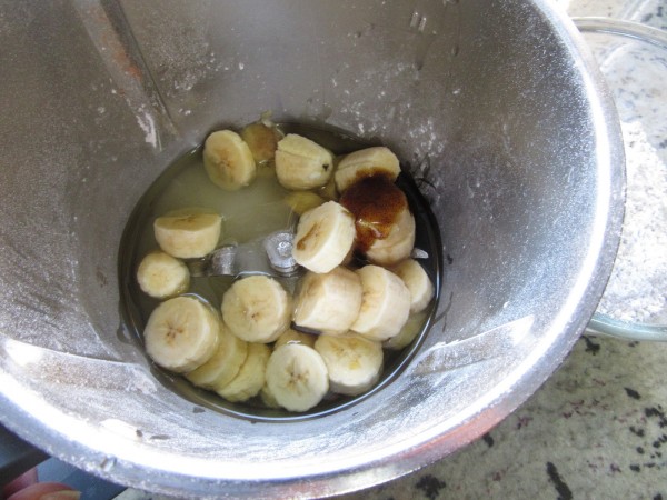 4- Triturar el aceite, azúcar, huevo, plátanos en trozos y vainilla.