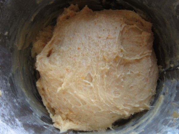 2- Agregar el resto de harina (300), yemas, huevo entero, mantequilla, azúcar , ralladuras y miel, y amasar hasta que esté elástica. Volver a dejar levar tapado hasta que doble volumen .