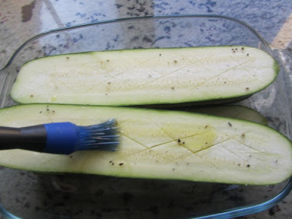 1- Cortar los calabacines transversalmente, hacer unos cortes en crus, salpimentar y pincelar con aceite. Tapar con film, hacer unos agujeritos y cocer en el microondas unos 8 minutos. Dejar templar y vaciar con una cuchara. Reservar pulpa y cascos.