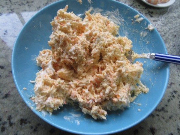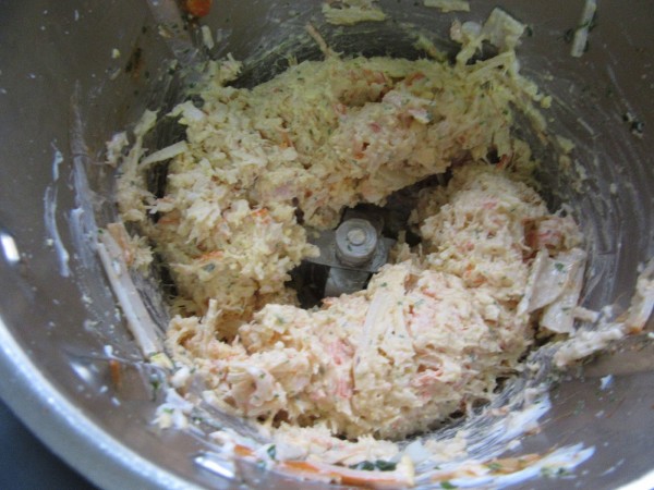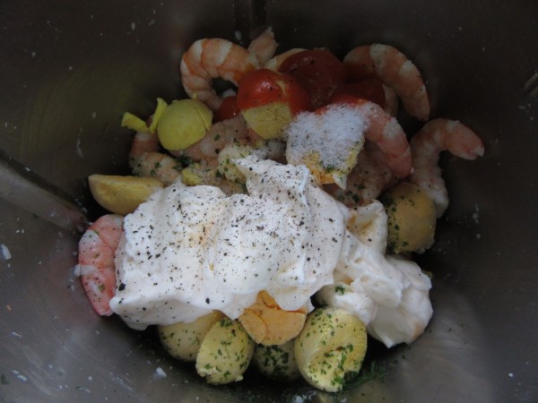 2- Con una picadora, Palitos cortados por la mitad, langostinos (Reservar 16 para adorno), yemas (Podéis dejar 2 para decorar), mahonesa, perejil picado, pimienta, ajo en polvo, tomate frito y sal , picar todo hasta que se forme como una pasta, sin llegar a molerlo del todo, que se noten trocitos.