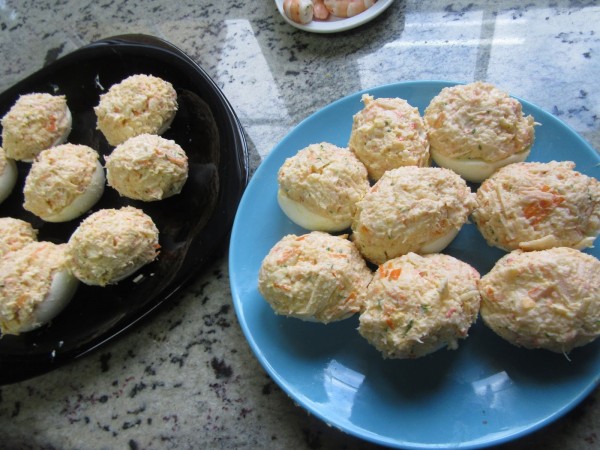 3- Rellenar los huevos, adornar con yema pasada por un tamiz o colador y un langostino en cada mitad. Servir fríos.