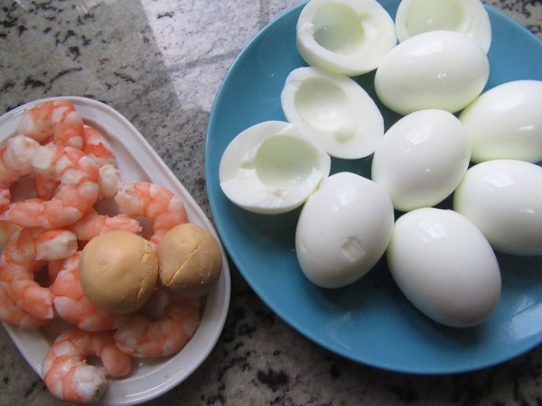 1- Cocer los langostinos pelados en agua con sal un minuto, sólo que cambien de color . Escurrir bien. Cocer los huevos en agua con sal y vinagre hirviendo unos 10-12 minutos. Refrescar , pelar , cortar por la mitad, reservar yemas y claras.