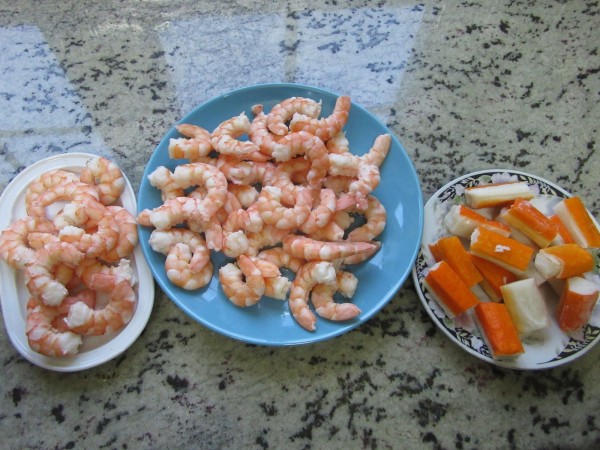 1- Cocer los langostinos pelados en agua con sal un minuto, sólo que cambien de color . Escurrir bien. Cocer los huevos en agua con sal y vinagre hirviendo unos 10-12 minutos. Refrescar , pelar , cortar por la mitad, reservar yemas y claras.