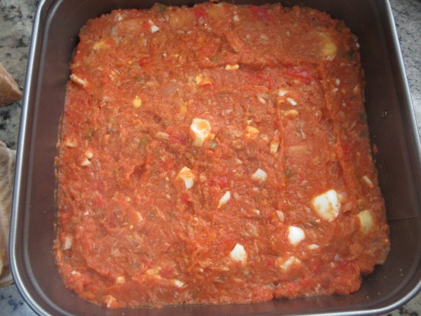 5- En una bandeja engrasada de unos 24x24 cm. Tapar agujeros con tiras de pan, aplastantdo un poco.Colocar 4 rebanadas de pan de molde, empapar con un huevo batido y extender la mitad del tomate. Tapar con mas pan, huevo y tomate y terminar con pan y huevo batido.