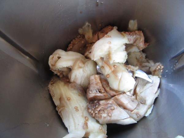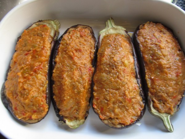 1- Cortar las berenjenas transversalmente, hacer unos cortes en cruz, salpimentar, tapar con film y llevar al microondas unos 12 minutos. Dejar enfriar y sacar la pulpa, reservar las pieles.