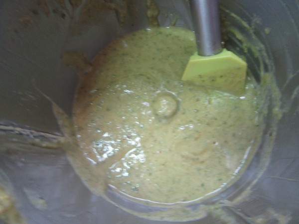4- Agregar el aceite y sal y emulsionar .Después el agua y queso rallado y volver a triturar.