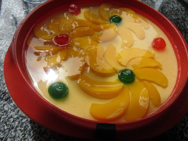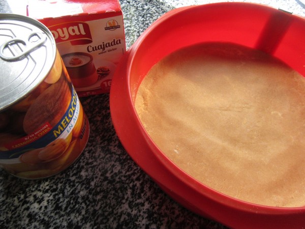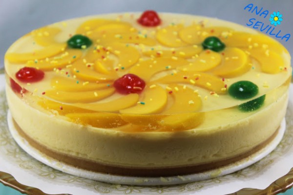 3- Cobertura: Colocar el melocotón cortándolo en rodajas sobre el relleno y guindas si se desea. Remojar la gelatina en agua fría. Calentar el almíbar de la lata del melocotón, que casi llegue a hervir, añadir la gelatina escurrida y mezclar bien. Dejar templar y echar poco a poco sobre la tarta. Llevar de nuevo a la nevera hasta que solidifique.