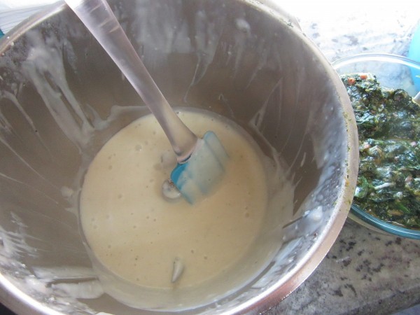 4- Añadir las espinacas, un poco de sal y el queso rallado, mezclar bien el conjunto. Cocer o remojar las placas de lasaña en capas como indique el fabricante.
