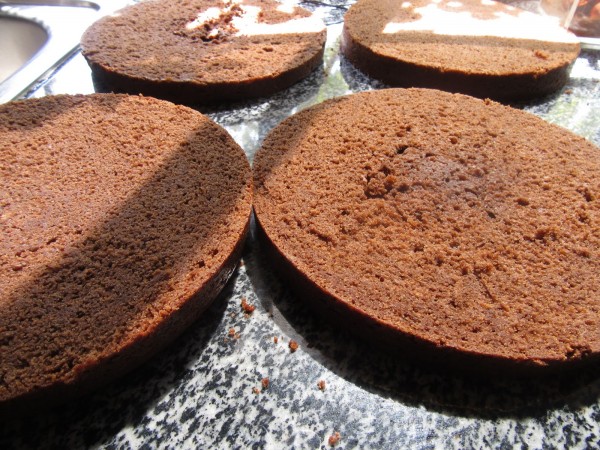 3- Introducir en el mismo molde que hicimos el bizcocho o en un aro extensible, la capa de bizcocho e ir rellenando capas. Llevar a la nevera.