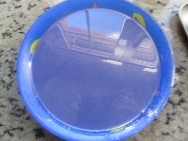 4- Agregar las láminas bien escurridas y colorante, mezclar bien. Dejar entibiar unos minutos y volcar sobre el relleno, dejándolo caer primero en la lengua para que no escarbe.