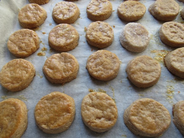 6- Espolvorear la mesa con un poco de harina estirar la masa, que queden un poco gruesos y cortar con cortapastas pequeños. Pintar con clara batida.