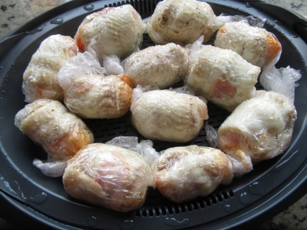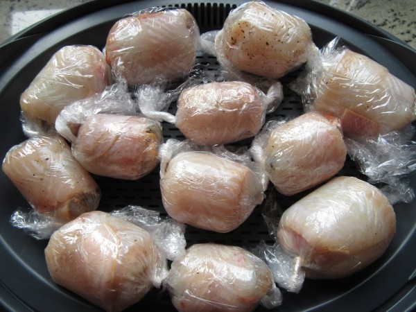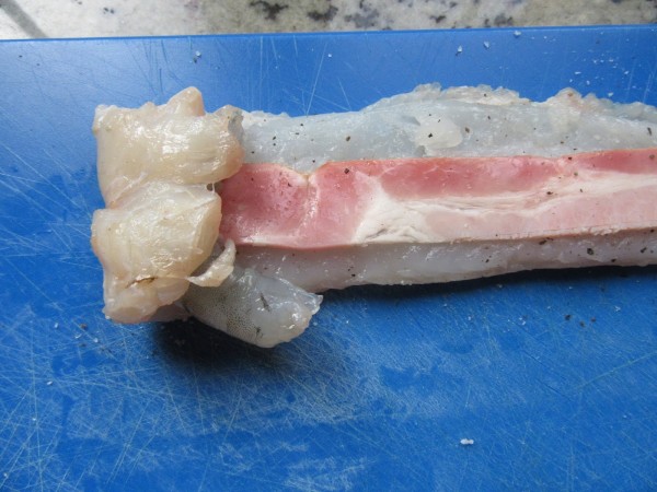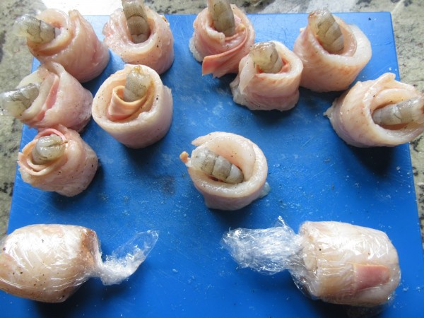 1- Extender cada lomito de lenguado, salpimentar, poner una tira de bacon y un langostino y enrollar, envolviendo con film girando los extremos, Hacer al vaor con una vaporera como unos 15 minutos.