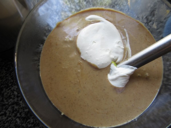 4- Montar la nata bien fría con varillas y unir a la crema. Primero poner un poco de nata en la crema y al contrario, con movimientos envolventes.