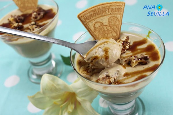 Servir en copas, y llevar a la nevera bien tapado. Adornar con nueces tostadas y caramelo.
