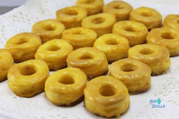 5- Glasa: Batir los 100 gr. del azúcar glas con el agua hasta que blanquee. Sumergir las rosquillas y dejar secar de nuevo.