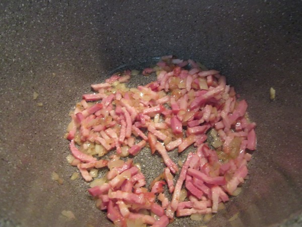 2- Añadir el bacon, sofreír un par de minutos, tomate, sal y 1/2 cta. de orégano, y sofreír 5 minutos a fuego suave. Reservar.