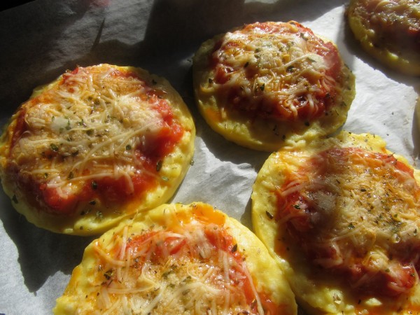 3- Sobre una bandeja forrada con papel de hornear, echar 2 cucharadas de la tortilla (Podéis usar un aro de emplatar) y encima una del sofrito de tomate, espolvorear con queso rallado y orégano. A mí me salen unas 6 tortillitas.