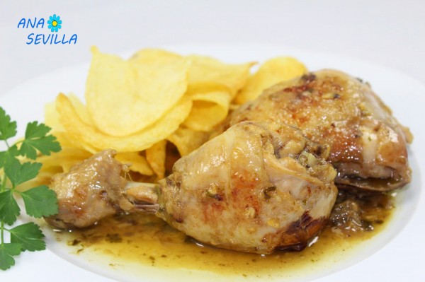 1- Trocear los contramuslos en dos trozos cada uno o hacer un pollo troceadoy la cebolla en cascos. Hacer un majado con los ajos, perejil y un poco de sal.