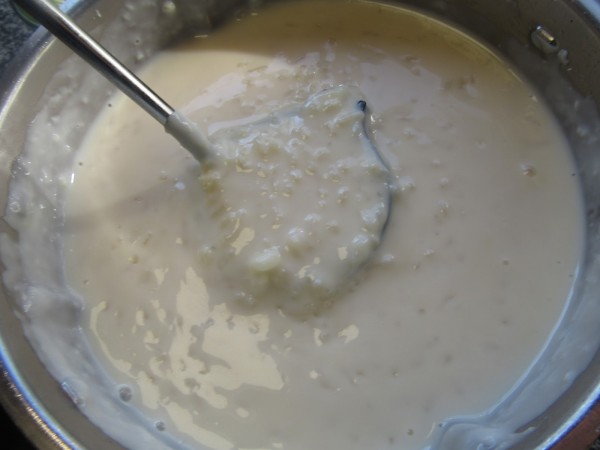 3- Añadir la leche, arroz bien escurrido, nata, azúcar, azúcar vainillado y coco rallado, y cocer unos 40 minutos a fuego bajo medio, removiendo hasta que espese y el arroz esté bien cocido.
