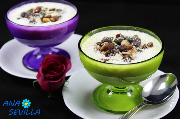 Servir en boles o copas, adornar con coco rallado y frutos secos con pasas.