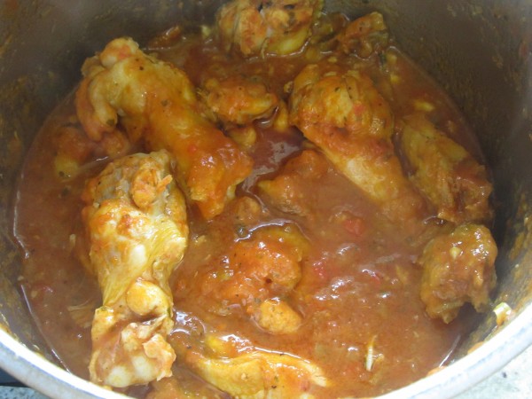 3- Agregar el resto de ingredientes, alitas, tomate, vino blanco, azúcar, cayena, laurel, perejil picado y sal, y cocer unos 30 a 40 minutos a fuego bajo-medio.