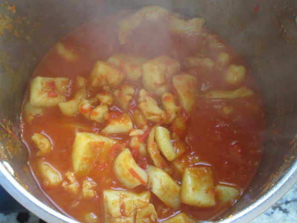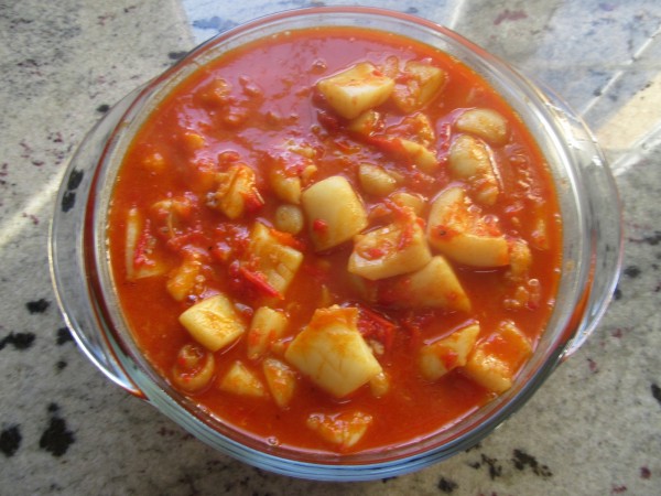 2- Añadir el pimentón, sepia, pimienta y cayena y guisar a fuego bajo-medio tapado, unos 25-30 minutos, hasta que la sepia esté blanda.