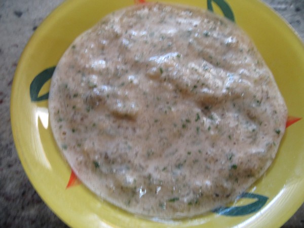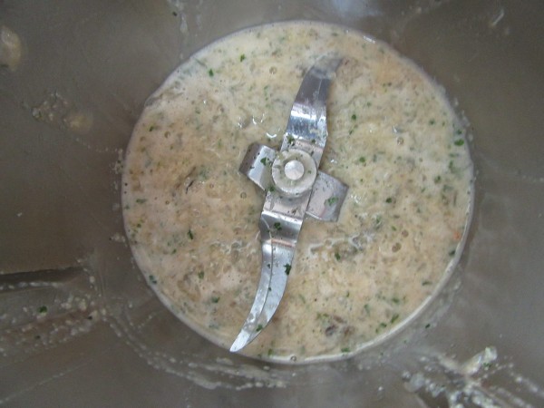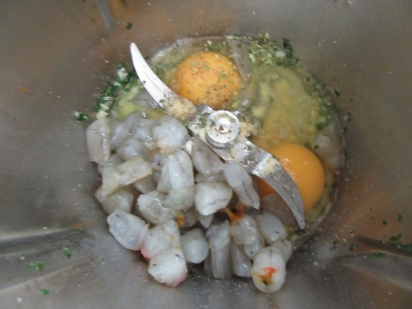 2- Añadir los huevos, sal, pimienta, orégano, pan rallado y 12 langostinos en trozos, y picar. Dejar reposar 20 minutos en la nevera.