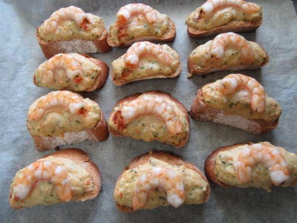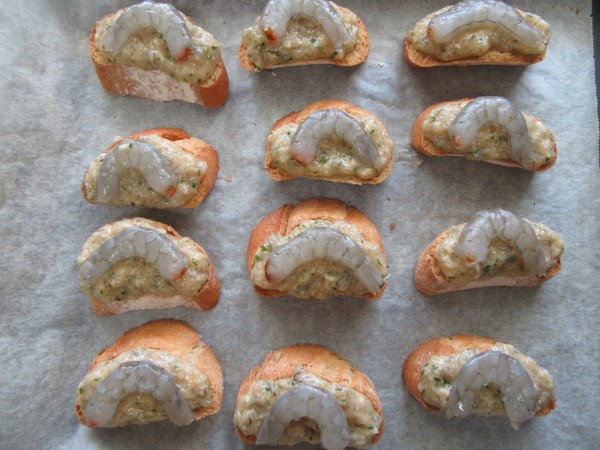 3- Mientras, pre-calentar el horno a 200º. Tostar un poco el pan en rebanadas rociando un poco de aceite. Sacar el pan y extender una cucharada del relleno, adornar con un langostino entero salpimentado.