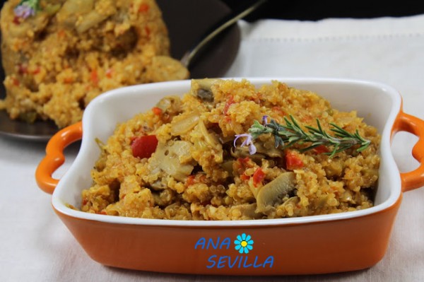 3- Pasar la quinoa por un colador por agua fría, removiéndola bien. Agregarla al sofrito, remover, y a continuación el caldo, champiñones y picada reservada, cocer 15-18 minutos a fuego bajo medio. Removiendo de vez en cuando.