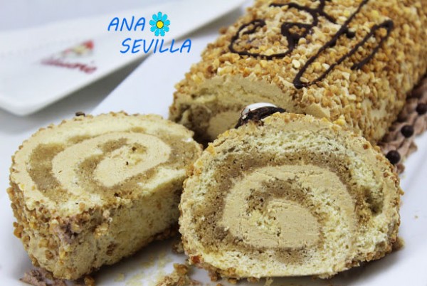 3- Pincelar el bizcocho con el almíbar si lo ponéis. Extender crema, enrollar y cubrir con una capa finita de la crema restante. Pegar crocanti.